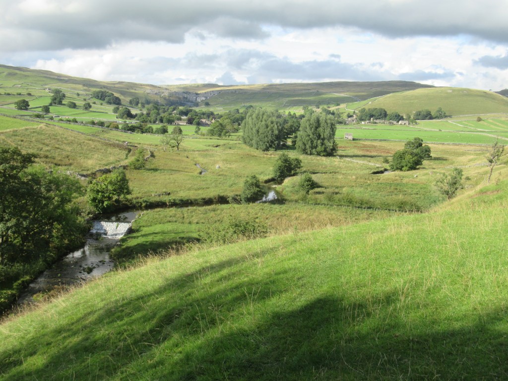 I climb away from the river then drop back down through farmland into Malham, with views of Malham Cove beyond. The sun is still shining, everyone looks happy, and Malham feels idyllic. I stop for a pint outside The Lister Arms. The four guys from earlier arrive not long after and offer to buy me a drink, but I have to go off and find a bed for the night.