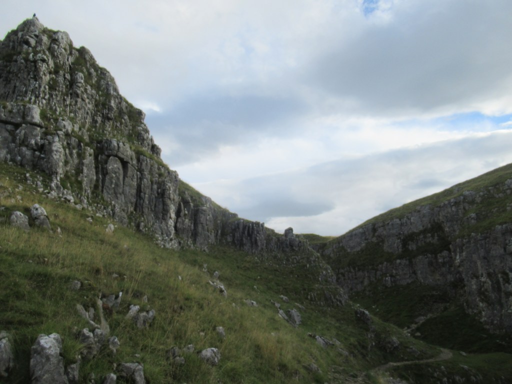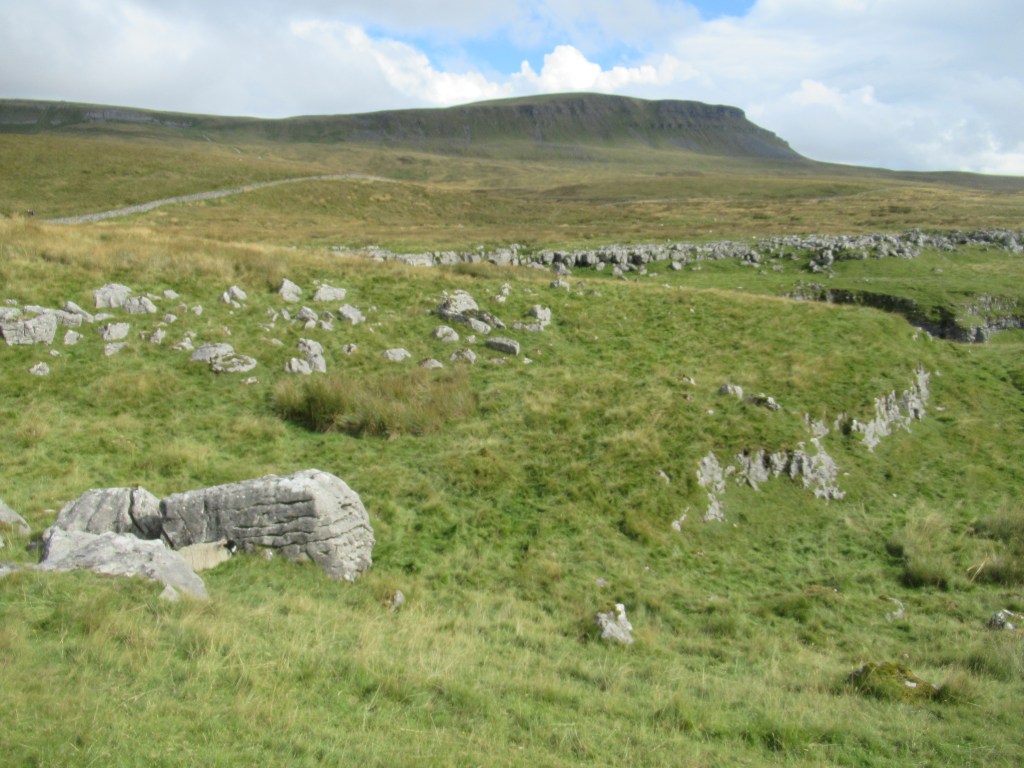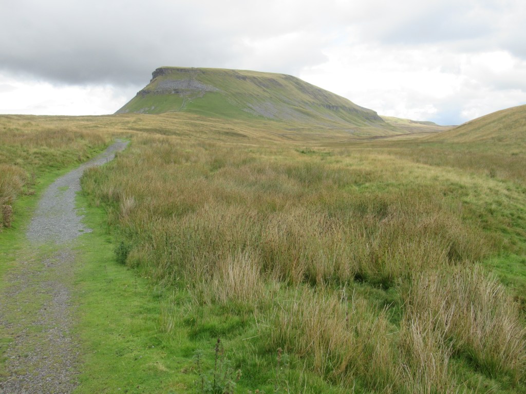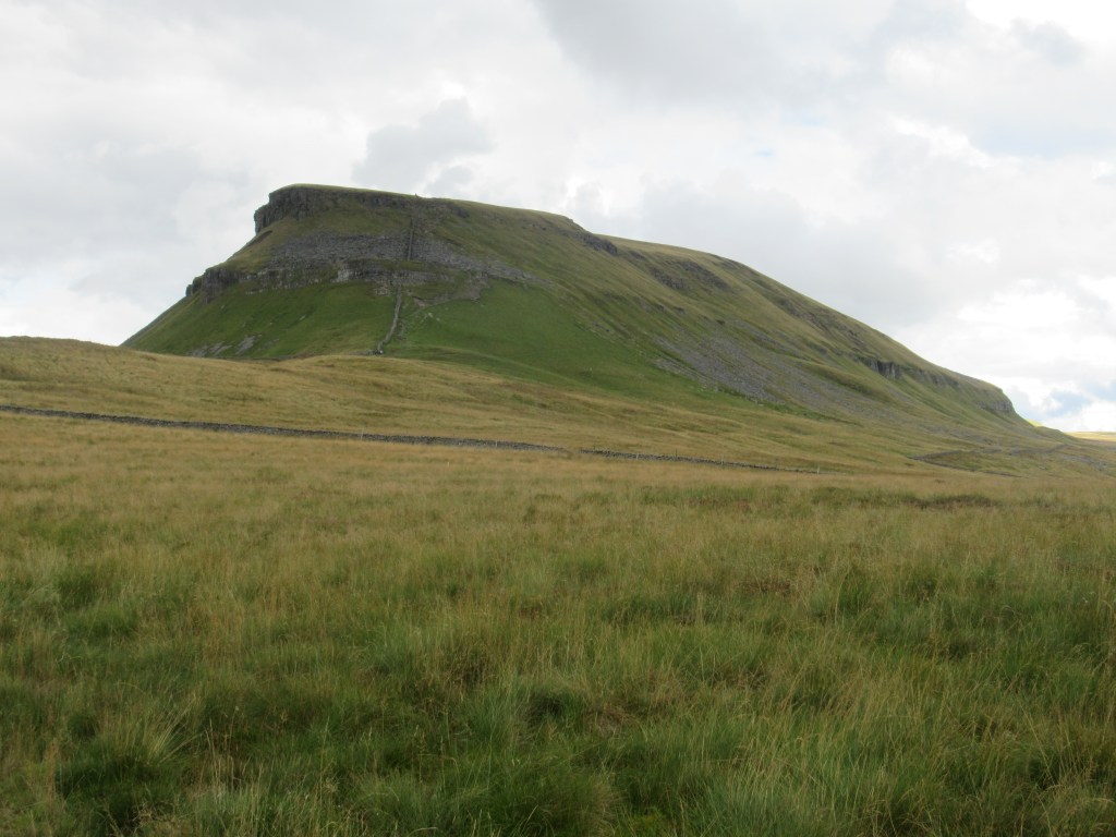 From Tennant Gill I continue along a pleasant trail to Fountains Fell, meeting a frog along the way. From here I get my first view of the intimidating bulk of Pen-y-Ghent. There doesn’t seem to be any way up the fortress-like structure that I can see, but I’m still feeling hungry and I know that dinner and a pint are waiting for me on the other side, so nothing is going to stand in my way.