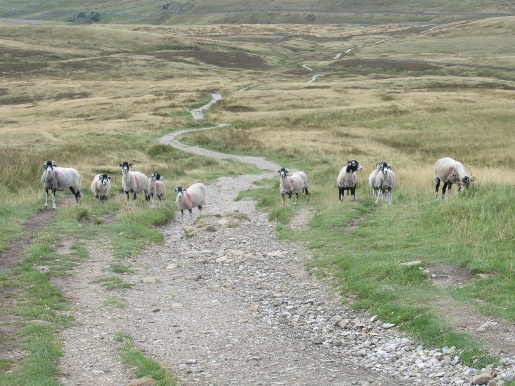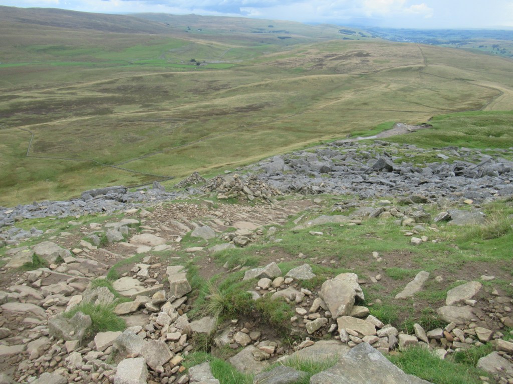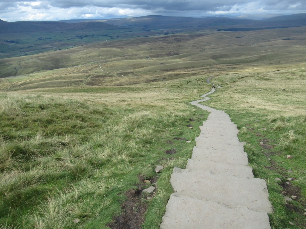 After some road walking and then a long, gradual climb to the shoulder of Pen-y-Ghent, I steel myself for the climb to the top. In the end it isn’t as bad as I expect. Taking it slowly, stopping to recover occasionally, and consciously controlling my breathing and walking pace, I get to the summit in 35 minutes. The view is spectacular. A complete 360o panorama of rolling hills stretching out into the distance, with barely any traces of visible human activity other than the landscape scouring caused by sheep farming and grouse shooting. It’s sometimes easy to forget, especially if you come from the crowded south, just how much wide-open land we still have on these small islands.