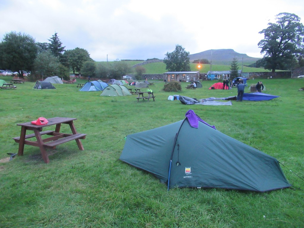 Once in Horton-in-Ribblesdale I stop for a well-earned pint in The Crown before heading for the campsite. I love this campsite – everything from the lovely old man at a desk who carefully writes all my details on a docket when checking me in, to the slightly festival atmosphere caused by a continuous stream of people arriving, opening drinks, pitching their tents, and firing up barbeques. I don’t know if it’s the coming weekend or if there’s an event on, but the small village is fast filling up with hikers.