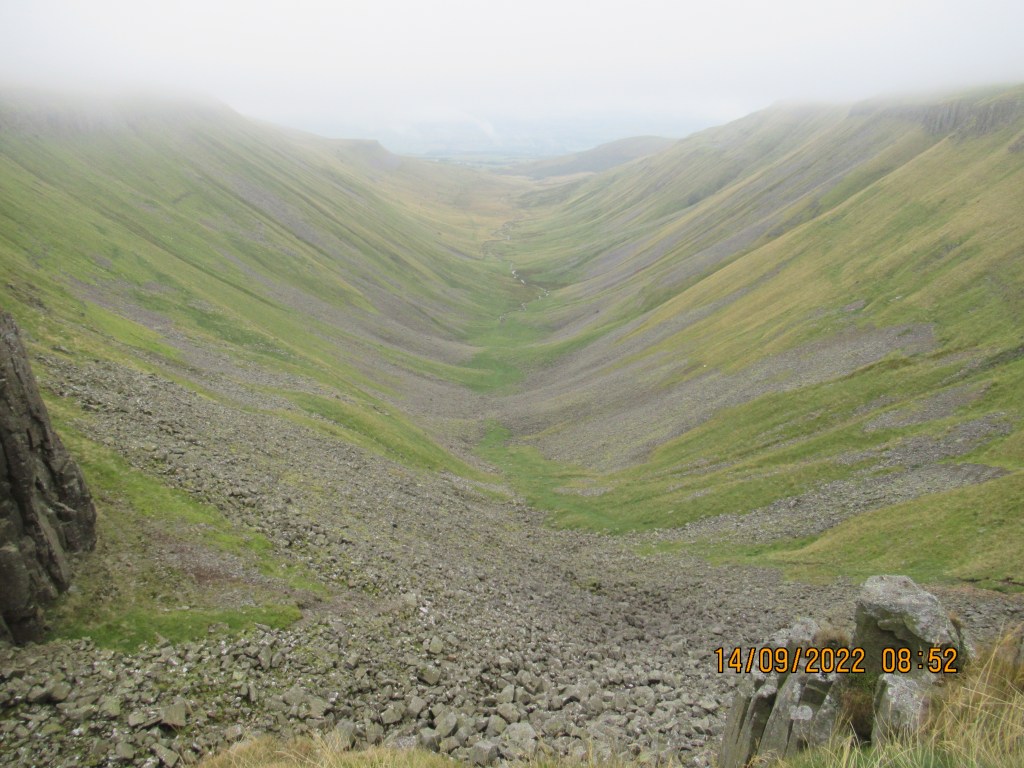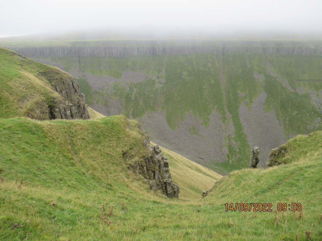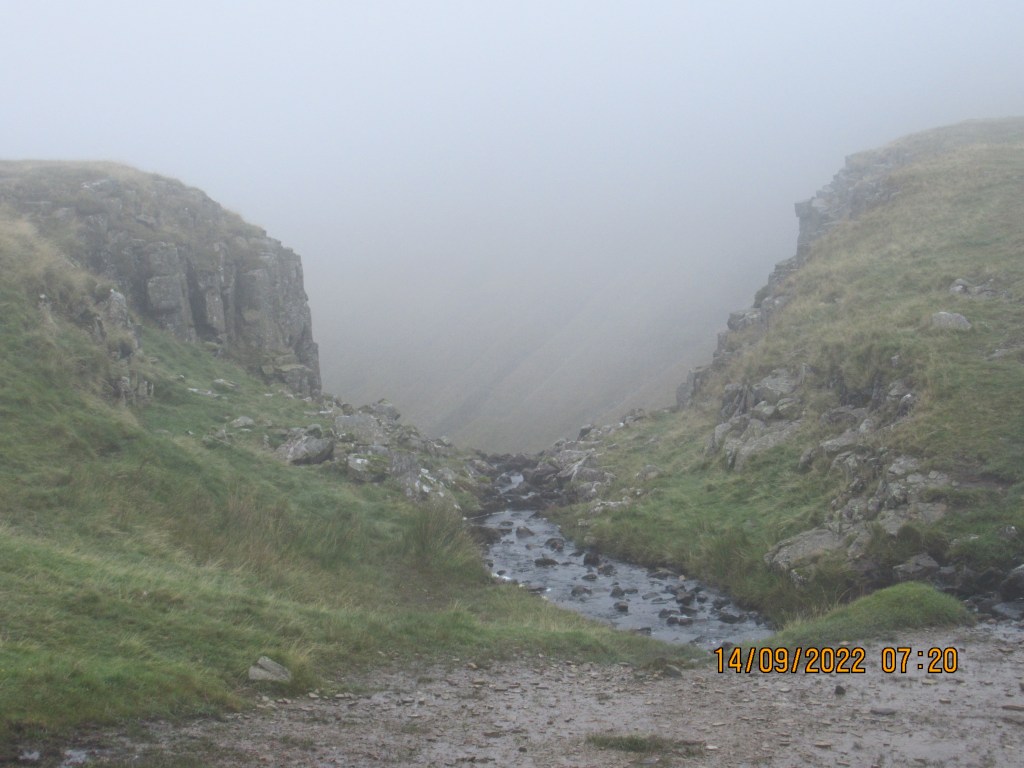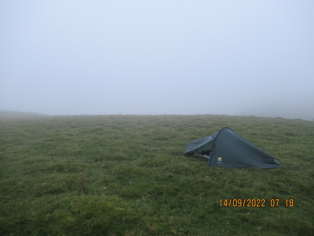 I must have really needed sleep last night because, despite the discomfort, I sleep right through my 6am alarm and wake up after 7am. Emerging into a thick fog, I immediately regret not taking a walk around last night and admiring High Cup Nick in clear weather. Now one of the most spectacular highlights of the PW is shrouded in mist.
