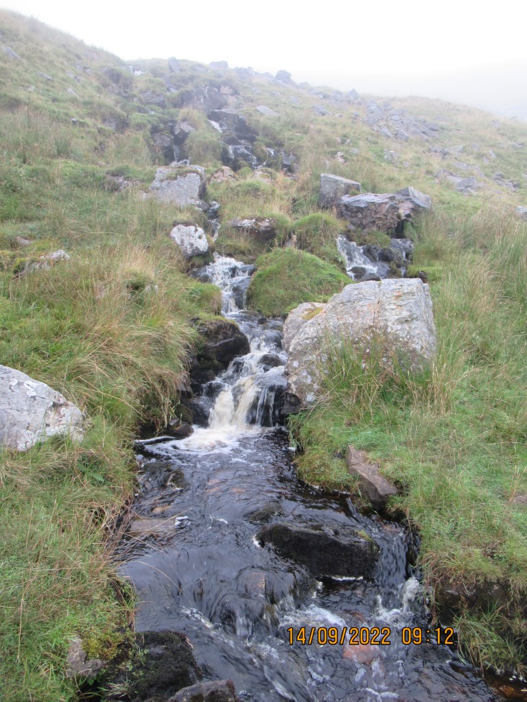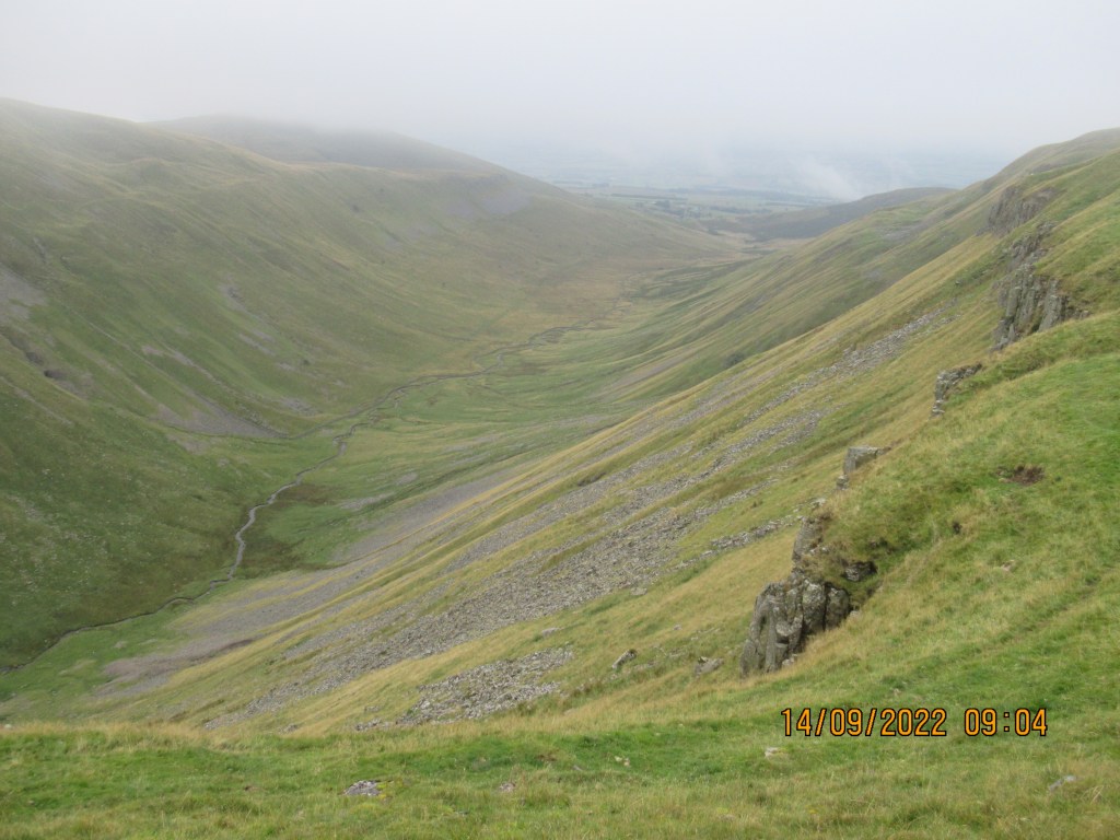 I take a couple of Ibuprofen and wait around for my tent to dry and for the fog to lift. By 8.30am the tent is still as wet as an otter’s dreams, so I pack it up anyway. By the time I’m ready to leave at 9am the fog has cleared enough to give breath-taking views down this glacial U-shaped valley and into the lowlands at the other end. I follow the trail across the top of the valley and along the top of the ridge on the opposite side. The remaining wafts of mist combine with the ubiquitous calls of Red Grouse and Ravens to enhance the atmosphere.