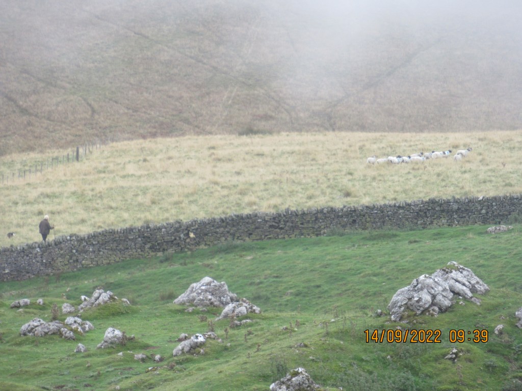 On the walk down into Dufton I stop to watch a farmer with a border collie wrangling a flock of sheep off the hills and into a pen. There are good views of the Lake District fells in the distance ahead of me.