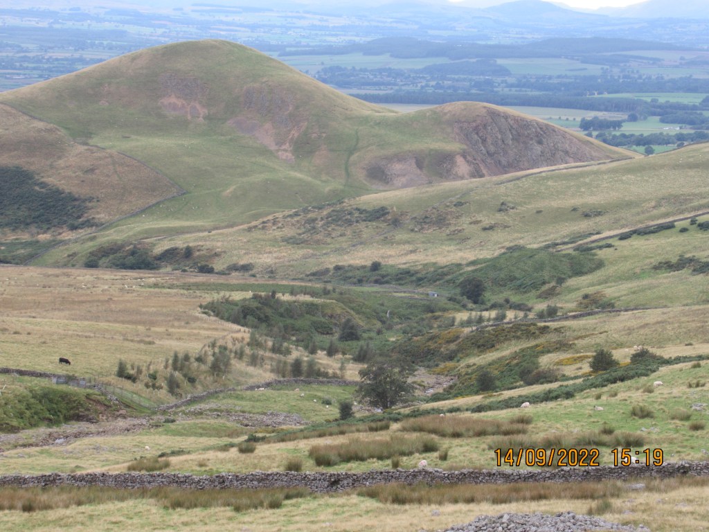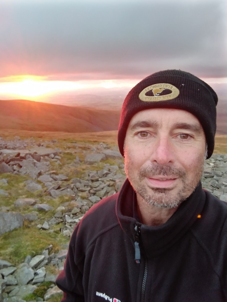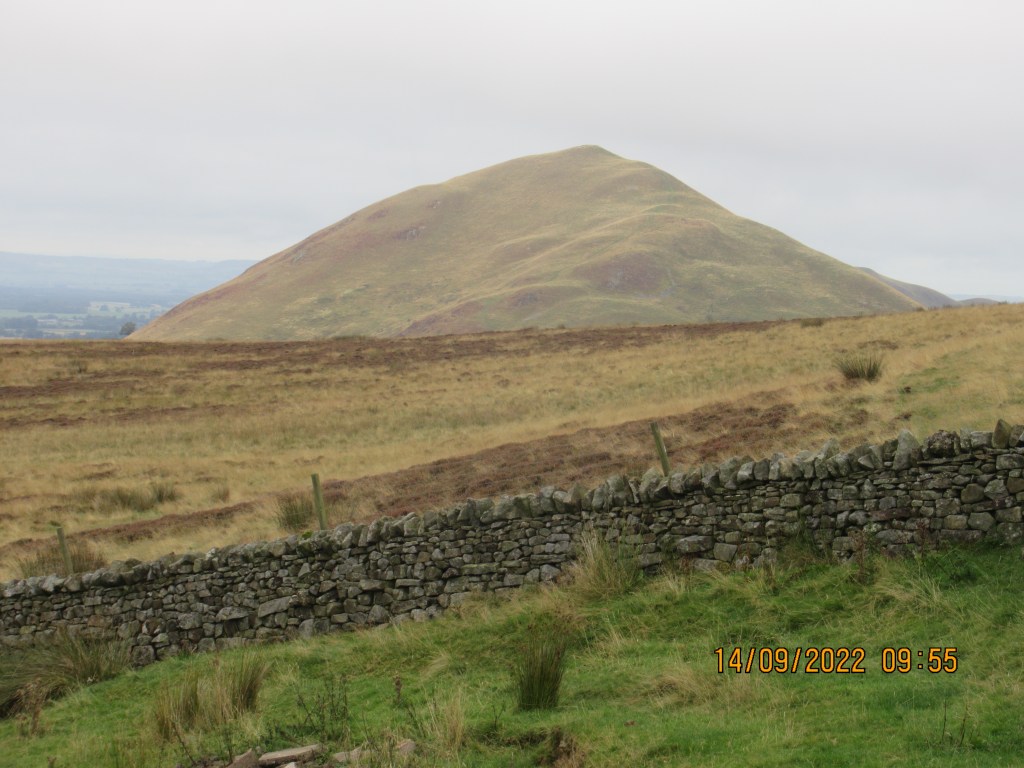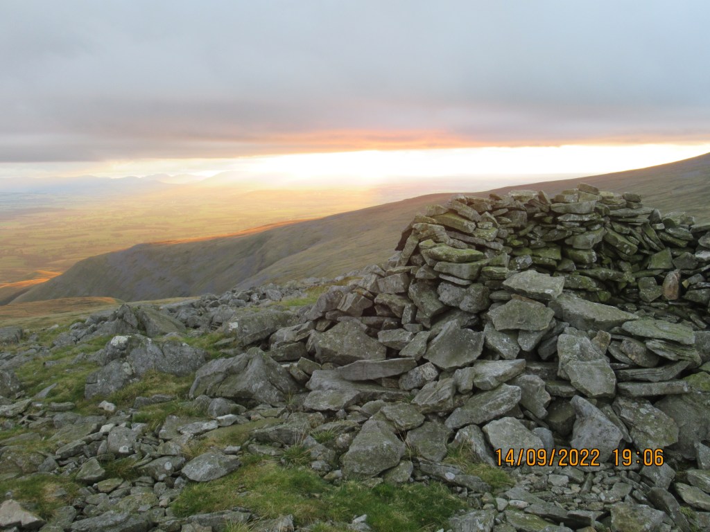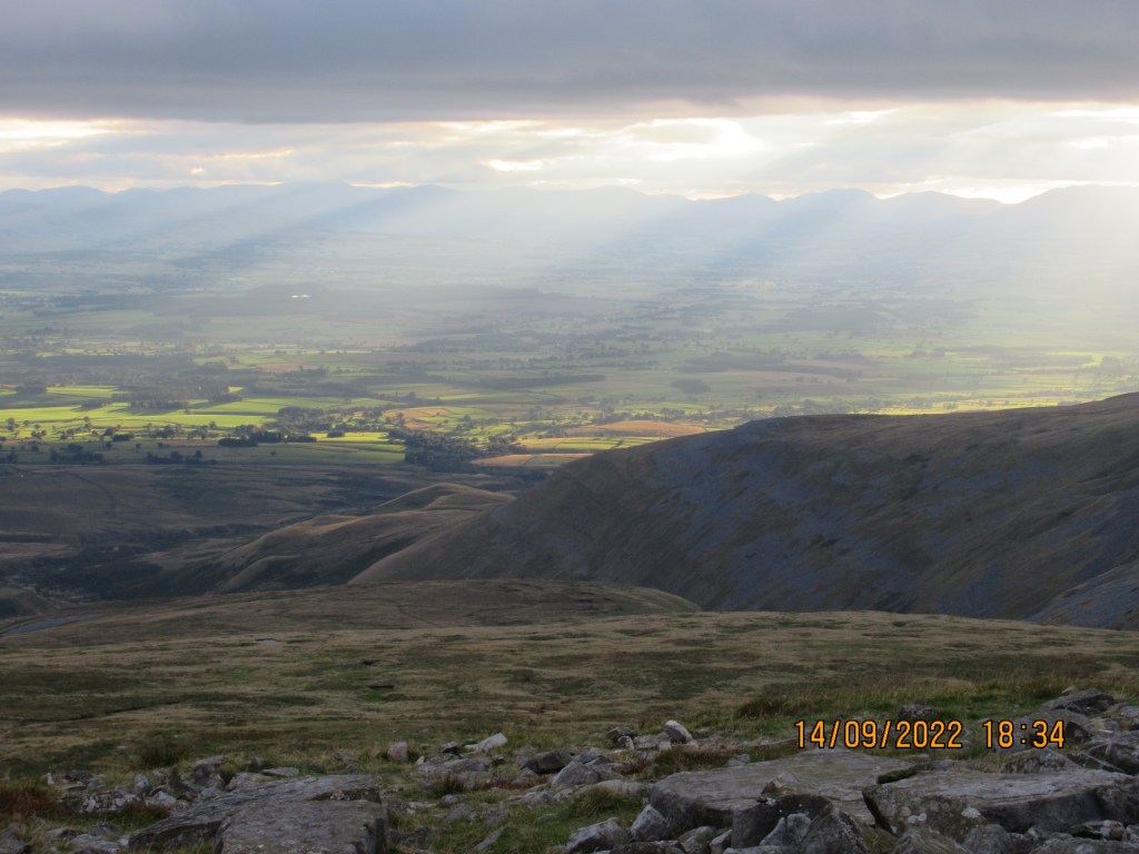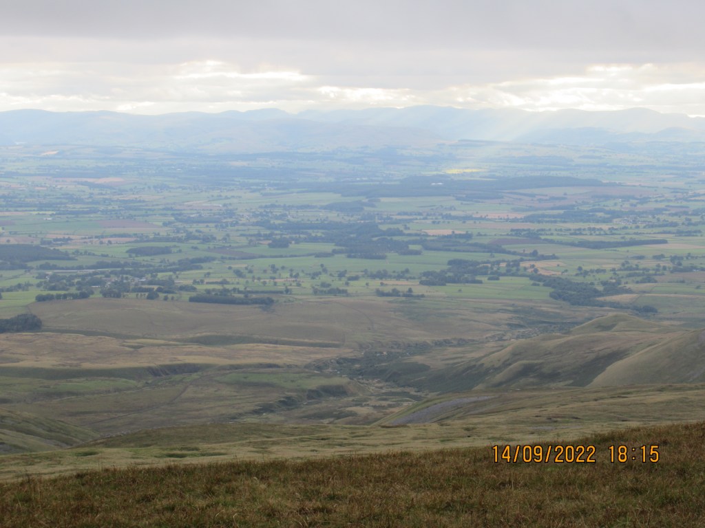 It’s a long, mostly steady climb, with a few steep kickers, up to Knock Fell. Every time I stop to catch my breath I look back the way I came at a magnificent view of the Lakeland fells in dappled sunlight filtering through the clouds, and the stretch of lower-lying farmland between here and there, spreading out vast distances to either side of my viewpoint.