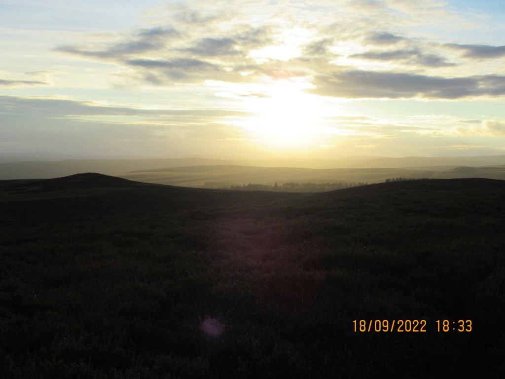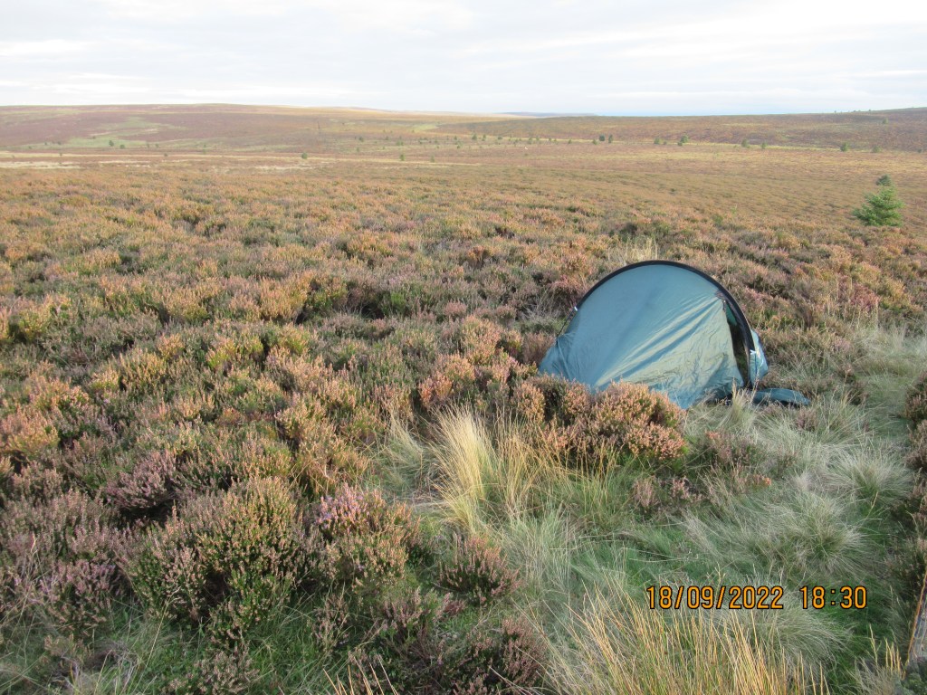 There is no clear, short grass area on which to pitch, so I plonk the tent onto some low heather. This gives a springy, comfortable surface and I soon get cosy in the tent out of the cold breeze.