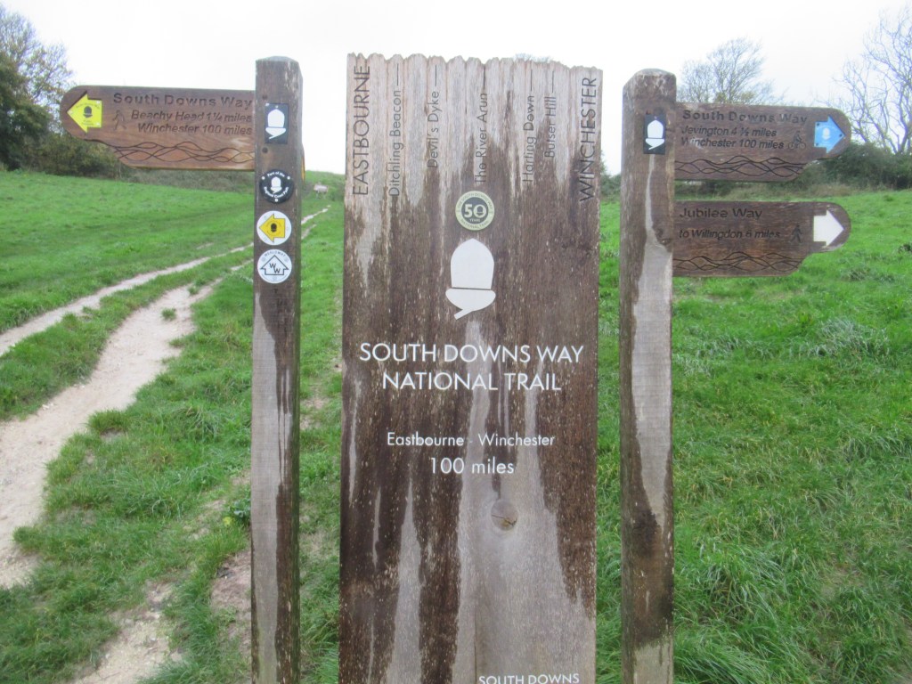 At the southern edge of Eastbourne, I reach the start of the South Downs Way as it heads uphill to the dizzy heights of Beachy Head. I had been looking forward to this part, but the weather is making it hard work. The higher I climb, the more I am buffeted around by blasts of wind catching my backpack and making it difficult to stay upright. The gusts are hitting me from unpredictable directions, making it a bit dangerous, so I try to stay well away from the cliff edge.