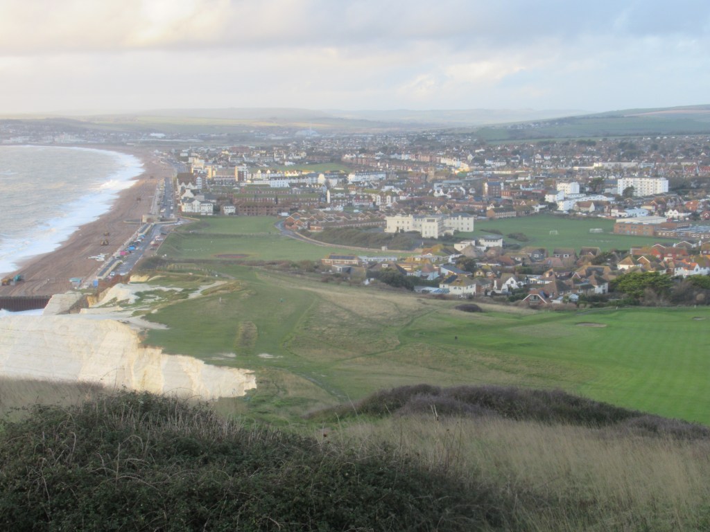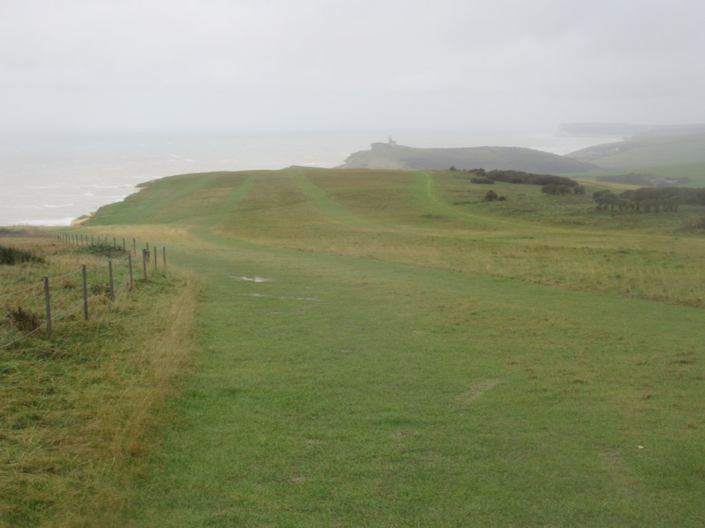 When I leave the pub and follow a muddy path back down the other side of the river, the rain stops and the sun comes out. I join the coast again at Seaford Head where the sky is becoming increasingly clear of clouds and I start to dry out. The best views of the Seven Sisters are attained from this point and I chat to a young photographer who has set up his camera and is waiting for the sunlight to hit the cliffs just right.