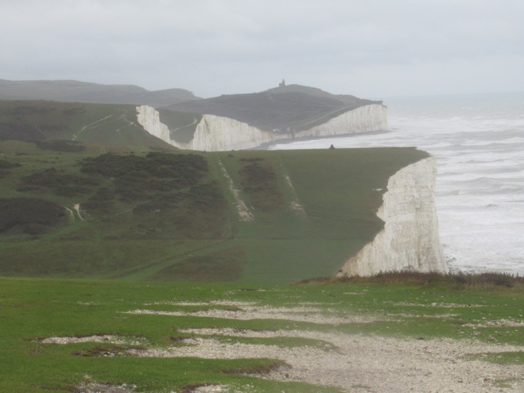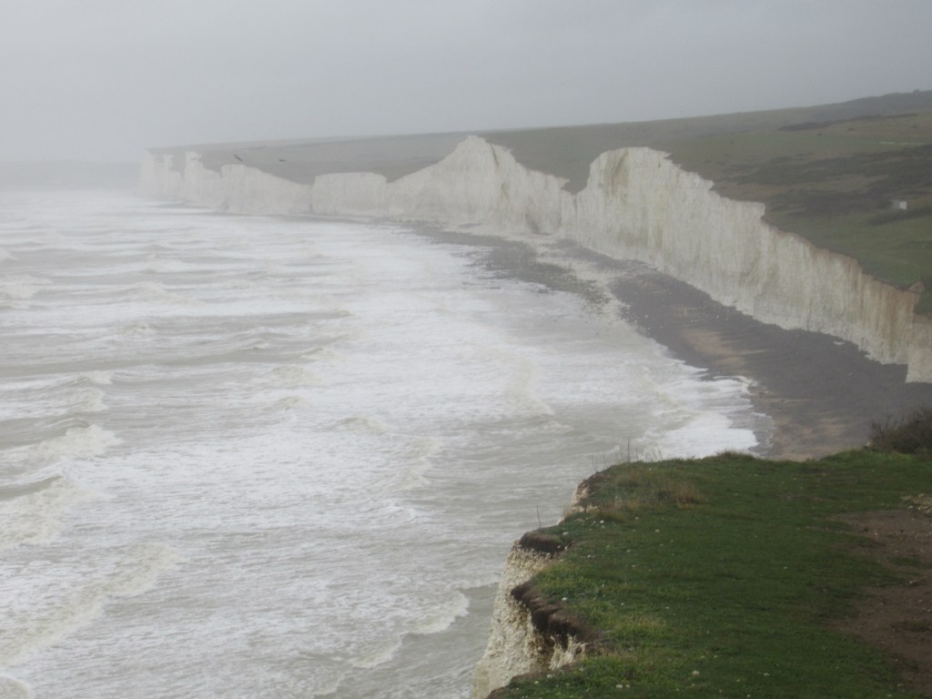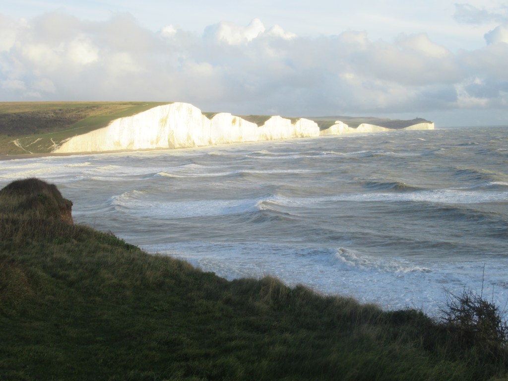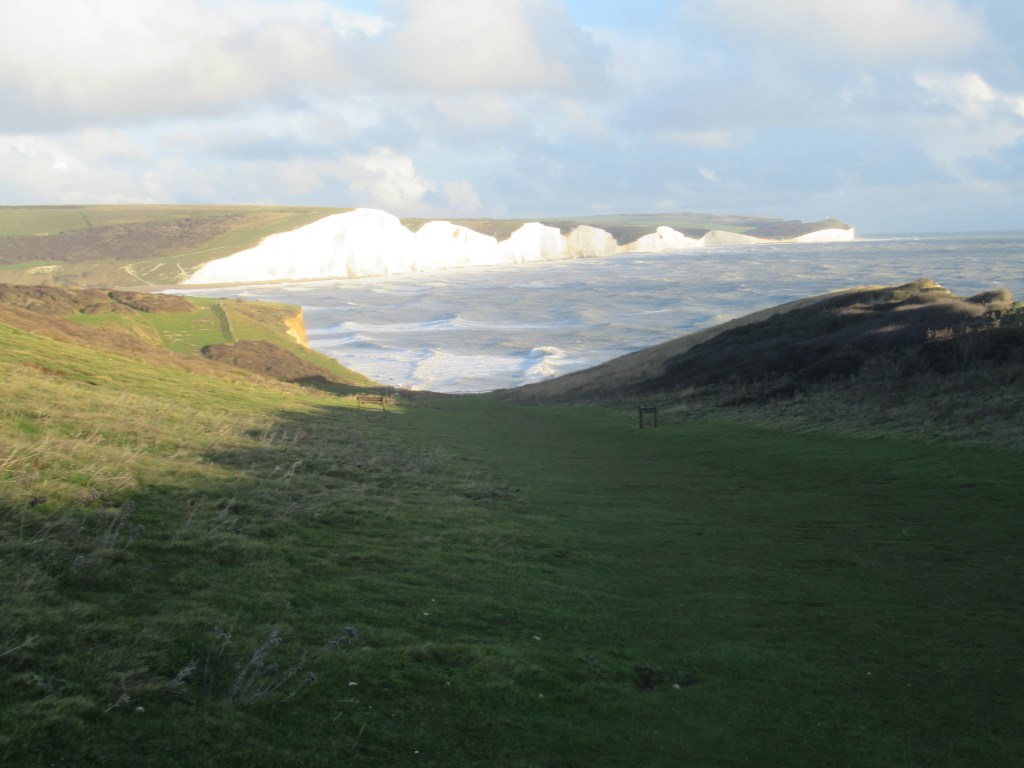 I am now ready to tackle the Seven Sisters – four or five kilometres of up and down hiking. I had been led to believe that this was quite a difficult walk, with plenty of hard climbing, but it isn’t actually too bad. Some bits are steep but each of the hills is very short. The wind seems to be coming from different directions but luckily it always seems to be blowing strongly from behind on the uphill parts, my backpack acting like a sail and pushing me upwards. I am careful to walk well away from the edge though, as sudden gusts are again hitting me from unpredictable angles and almost knocking me off my feet. Going up Seven Sisters, one after another in quick succession, was always going to be somewhat exhausting! (Oh do give it a rest, Davies).