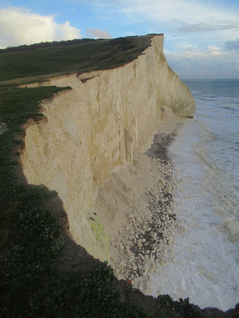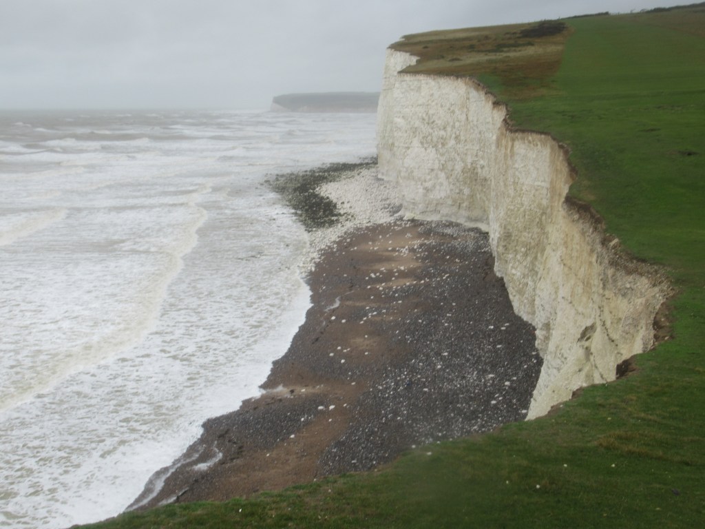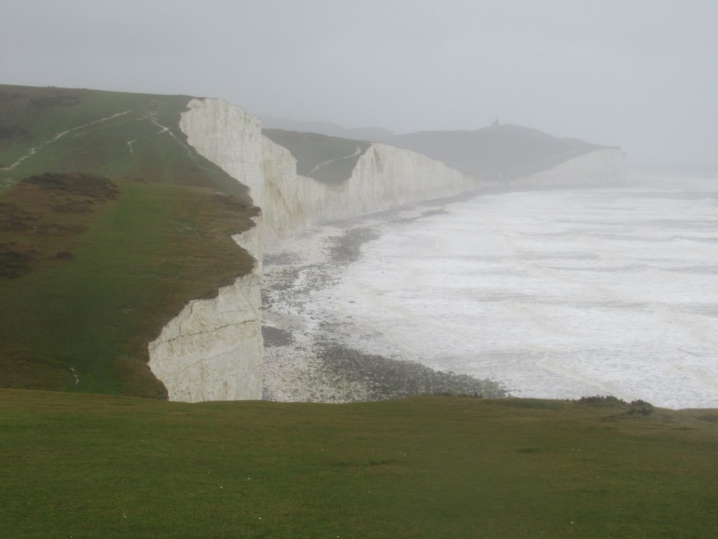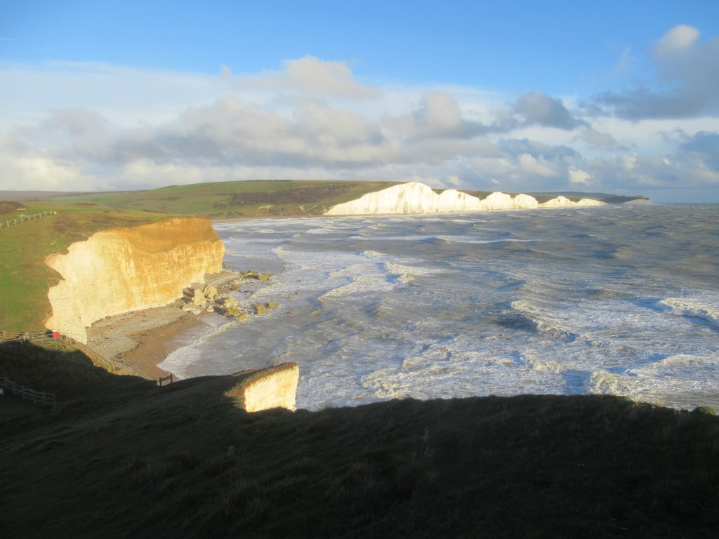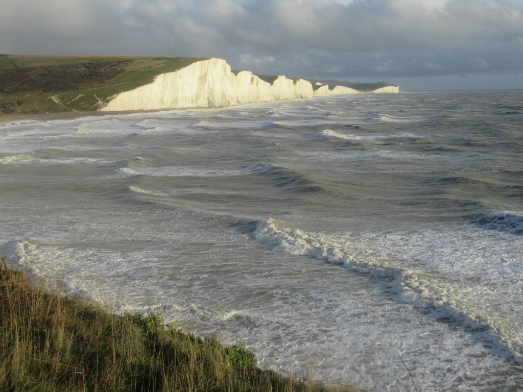I am now ready to tackle the Seven Sisters – four or five kilometres of up and down hiking. I had been led to believe that this was quite a difficult walk, with plenty of hard climbing, but it isn’t actually too bad. Some bits are steep but each of the hills is very short. The wind seems to be coming from different directions but luckily it always seems to be blowing strongly from behind on the uphill parts, my backpack acting like a sail and pushing me upwards. I am careful to walk well away from the edge though, as sudden gusts are again hitting me from unpredictable angles and almost knocking me off my feet. Going up Seven Sisters, one after another in quick succession, was always going to be somewhat exhausting! (Oh do give it a rest, Davies).