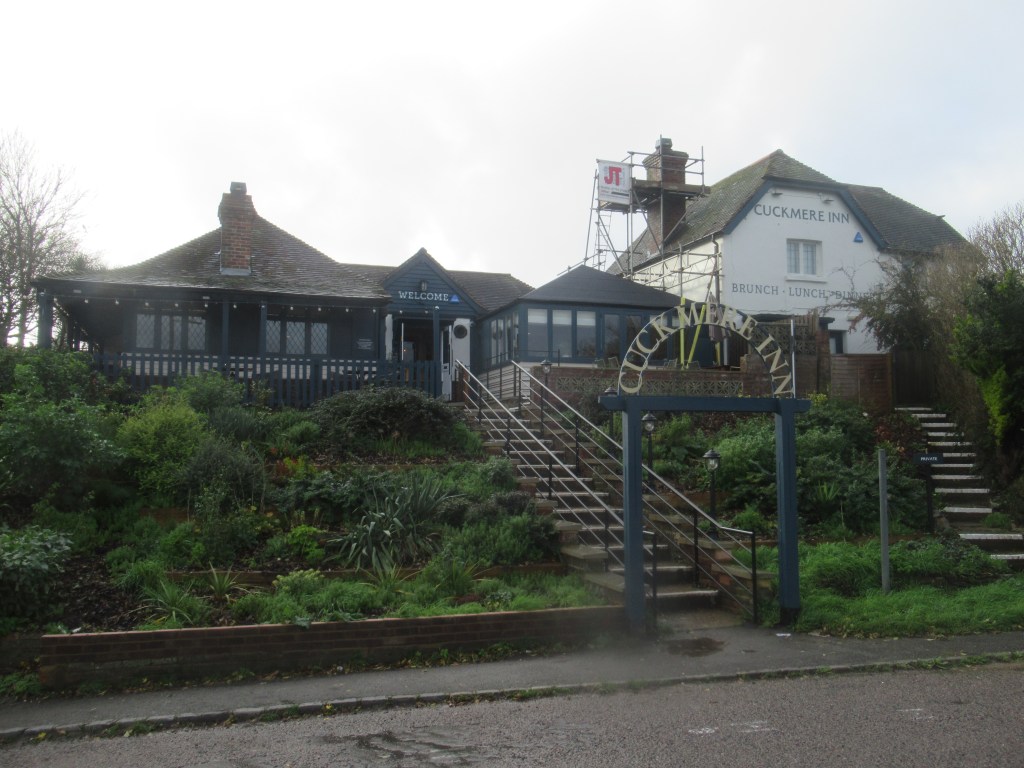 Eventually I reach the end at Cuckmere Haven and turn north, descending from the cliffs down to the river. I wade through a shallow bit of water to take a shortcut to Exceat Bridge. I cross the Cuckmere River and stop for a pint at the Cuckmere Inn, sitting at a sheltered outdoor table so that I don’t shed gallons of rainwater inside the pub. There are huge numbers of birds on the marshes here but I can’t be bothered fishing into my well-wrapped pack for my binoculars.