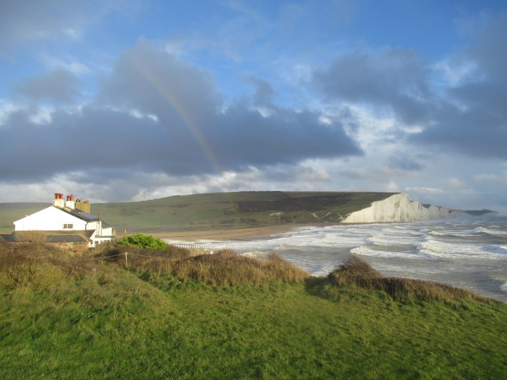 Moving along I keep looking back every few paces at the spectacular view. Eventually all the Sisters are lit by the sun and glow beautifully white. A complete rainbow appears, arching from one side of the bay to the other. I hope the photographer is getting all this from his viewpoint. I also can’t resist firing off multiple shots. The exceptional views continue even as I walk further west around Seaford Head, and I keep stopping to look back and appreciate them.