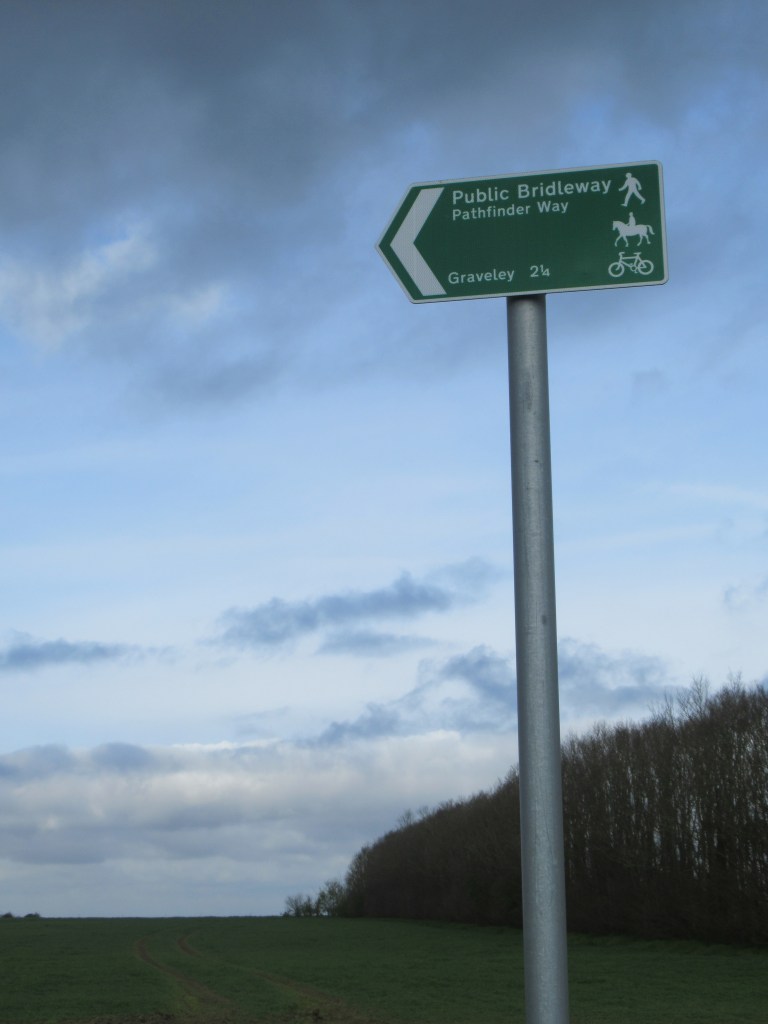 The track comes out onto a road which descends into the village of Graveley. This is the fourth and final Pathfinder airfield site, and the village sign features bombers and an airman. At the other end of the village, the path undulates through a pleasant wooded lane filled with bluebells. This is one of the most pleasant stretches of the whole walk, and definitely the hilliest – we’re clearly not in The Fens any more.