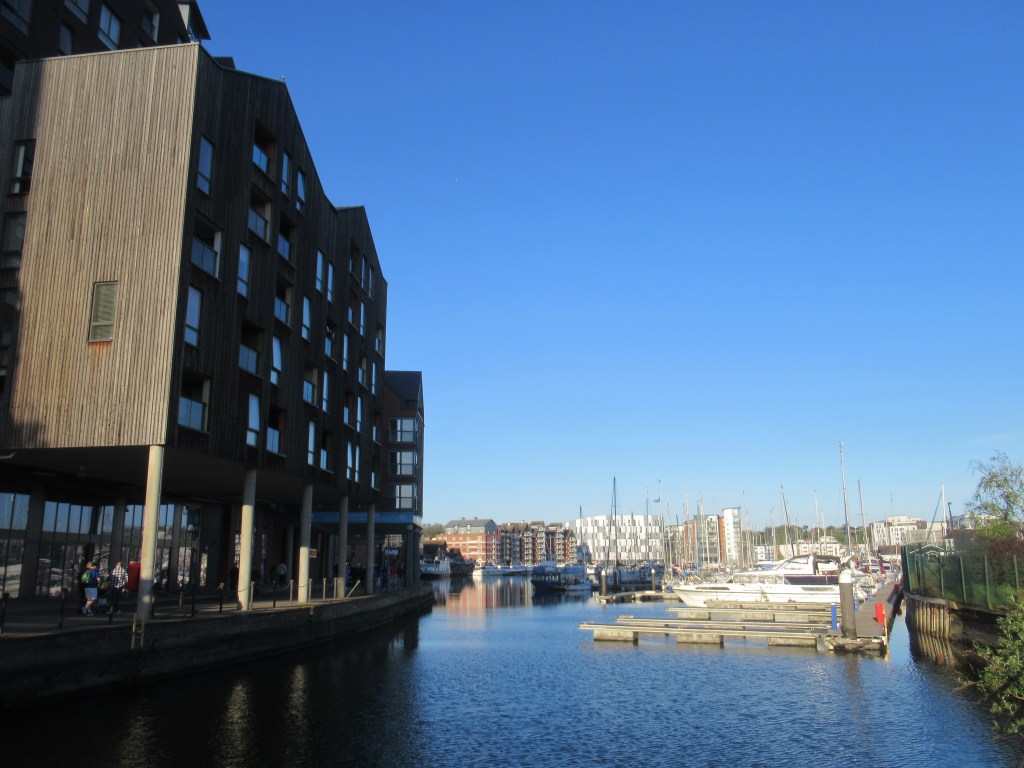 The river is now much wider and becomes tidal as it flows towards the estuary. At some point here it stops being the River Gipping and becomes the River Orwell for reasons best known to itself. I reach the end of the walk at Stoke Bridge, with its heavy road traffic, but continue a short way to the docks on the other side. In the mid 80s I did a college course here and used to walk through the docks. At that time they were a bit rough and dilapidated, with only a couple of facilities still operating. Since then they have been regenerated, with flats, bars and restaurants, and are now filled with various leisure craft. It is early evening on a Saturday and the area is lively with people enjoying the sunshine. In a happy frame of mind, I head to the station to catch the train back along the route I have just walked.