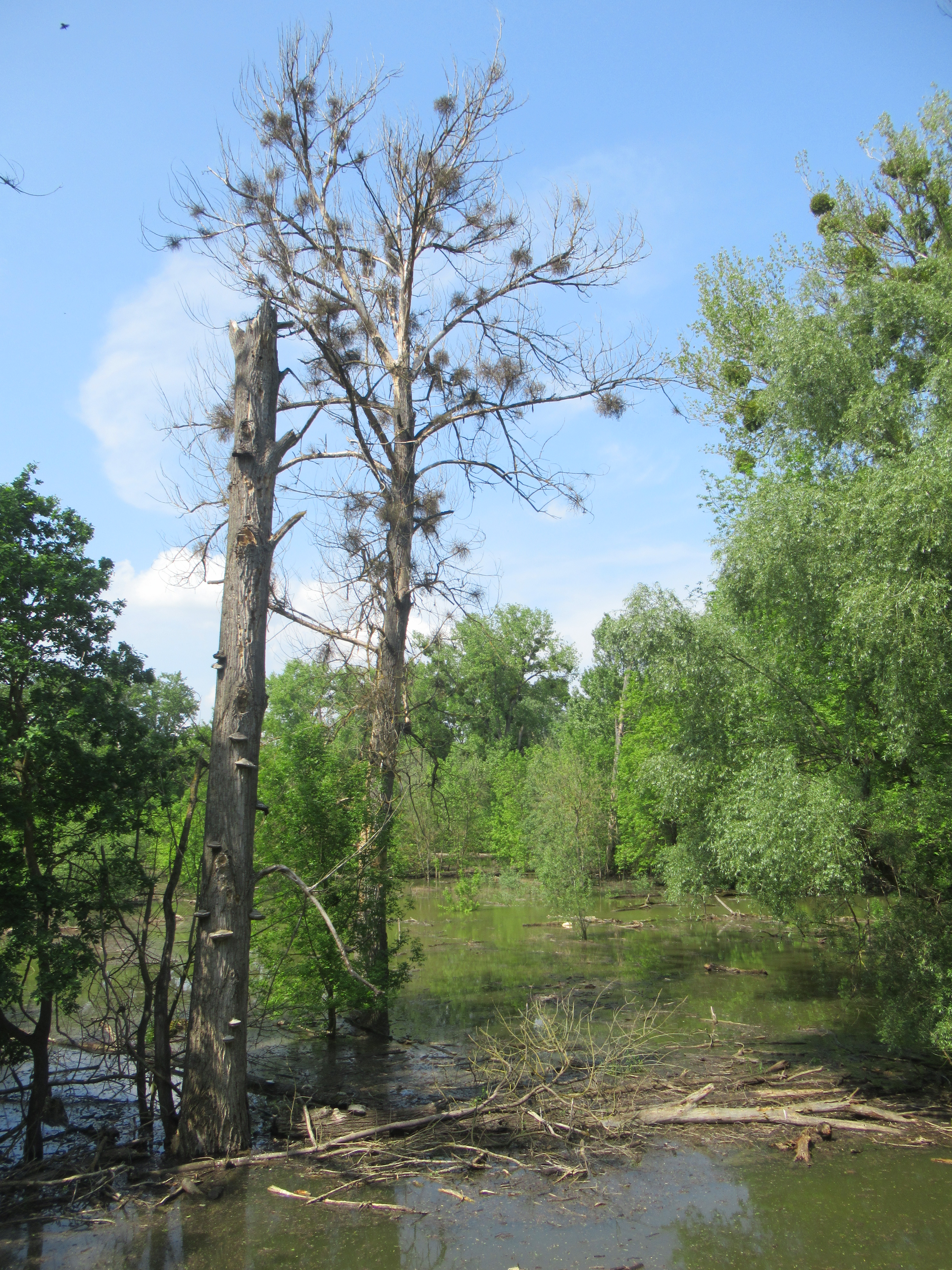 The habitat of the reserve is mostly wet woodland, accessed by a few paths and a raised embankment. Some of the paths are flooded and impassable, due to either beaver activity or to the heavy rain that they’ve had recently. This is the floodplain of the River March, known as the Morava in Slovakia, a tributary of the Danube. The raised embankment is the best route through the woods and, as it’s a Saturday, quite a few locals are out today. One group is being guided on a nature walk and I invite them to watch a White Stork’s nest with four chicks through my scope. There are plenty of stork nests here, either in trees or on buildings. A couple of times I see Tree Sparrows that have made their nests amongst the sticks. In this video, a Tree Sparrow lodger can be seen emerging from the right at about 1 min 35 secs.