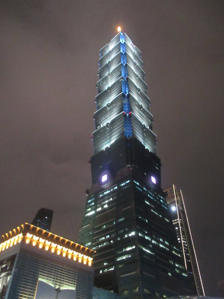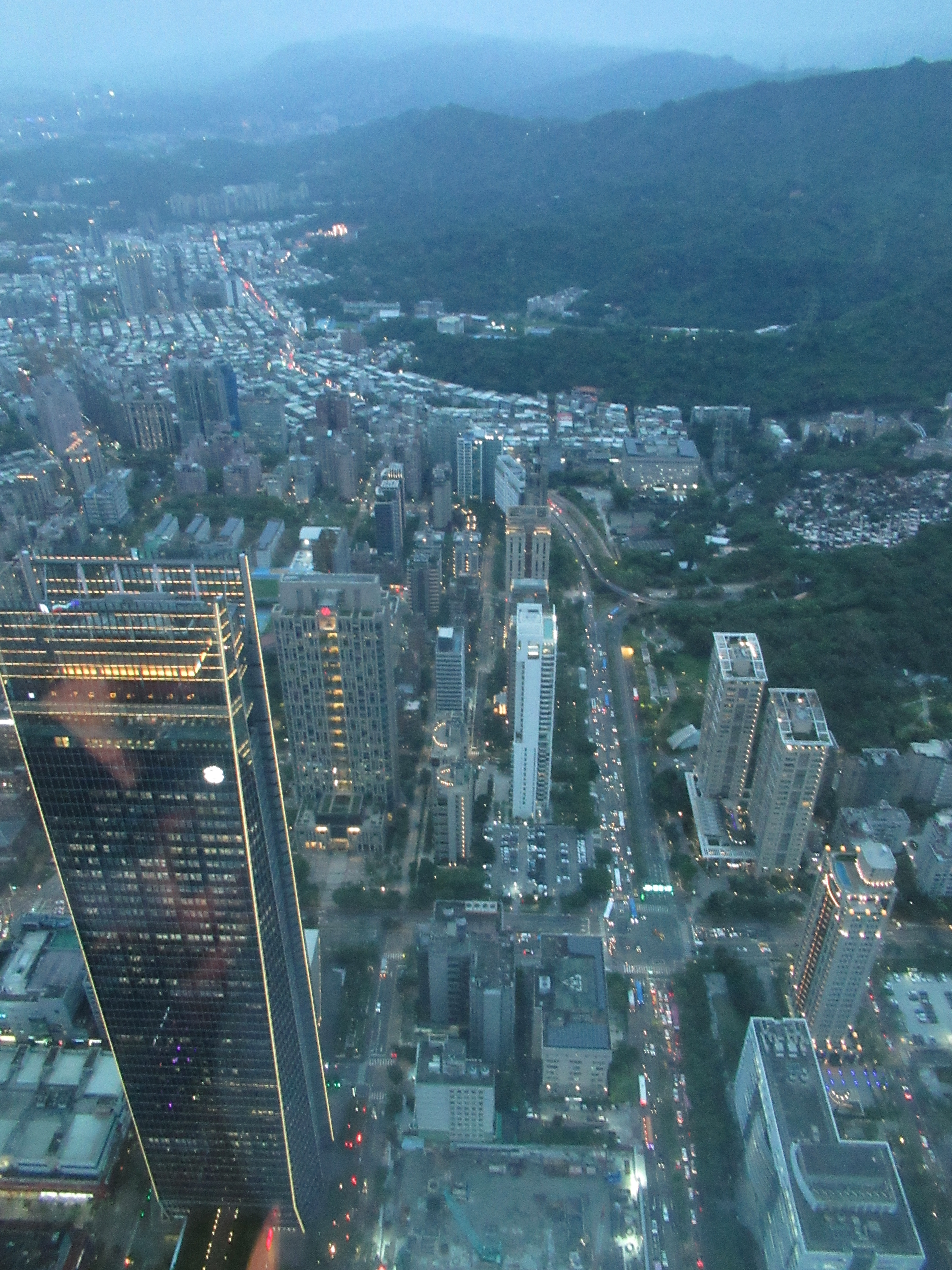 By the time I emerged it had started raining and I began to re-think my plan to go up Taipei 101 – the tall tower that has become a symbol of the city. I wanted to go up before dusk to get views over the city both in daylight and at night, but the views would now be severely restricted by the rain and low cloud. I decided to try anyway, so made my way there on the metro and, by the time I had bought a ticket in the Taipei 101 shopping mall, the rain had eased off and all but the most distant views of the surrounding hills was visible.