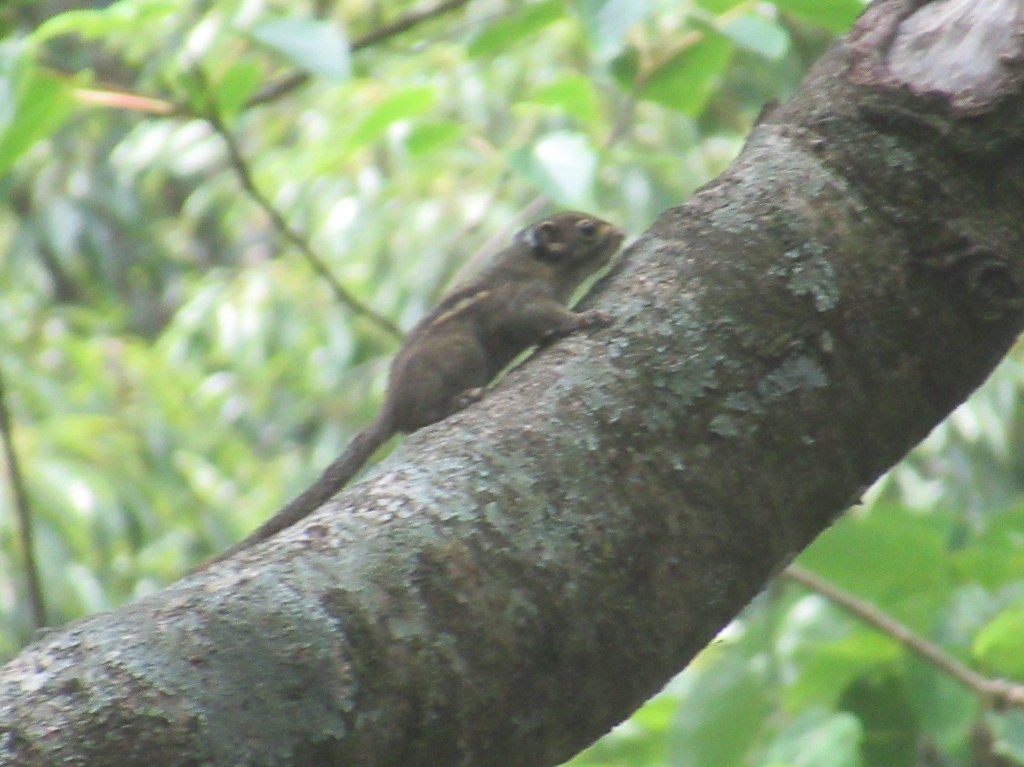 We checked into our accommodation in the park for the next three nights – the only location where we spent more than one night – and after dinner we had a brief session of spotlighting around the lodges. We saw no night birds but we managed to get a Red-and-white Giant Flying Squirrel – an impressively large beast whose long name says it all really. It is obviously red and white and obviously a ‘giant’ by squirrel standards. I didn’t get to see it ‘fly’, but the loose gliding membranes between its front and back legs were visible as it climbed around in the trees. No photo was possible but this one, in the lobby of a later hotel, was much more obliging: