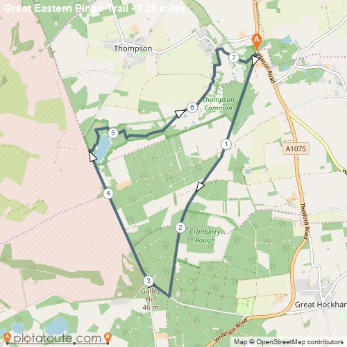 A seven mile (11 km) walking trail has been waymarked through the area, giving an opportunity to view a selection of these pingo ponds and the rare animals and plants that have made them their home. The Pingo Trail, or to give it its full name: The Great Eastern Pingo Trail, is a circular walk, so it can be started anywhere along its length. The most convenient place is the car park near the village of Stow Bedon. Without a car the Pingo Trail is not the most convenient place to get to – it took me two trains, a bus, and a 1.7 mile (2.8 km) walk – but once there you can set off in any direction. The signposts say it is an eight mile (13 km) loop but measuring it on Google Maps it is only seven miles (11 km) in a roughly triangular shape.