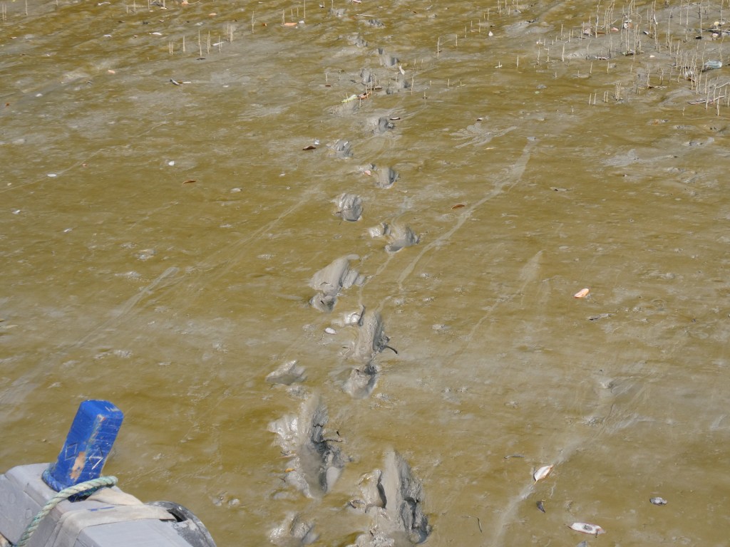 We arrived at a place called Shekhertek, where another concrete boardwalk surrounds the historic Shibsha Temple. We only had time for a brief visit as it is not permitted to be on the boardwalk after dark due to the particularly high numbers of tigers in this area. In fact, pugmarks were fairly common in the sand, as well as a set of tracks from one of the smaller cats.